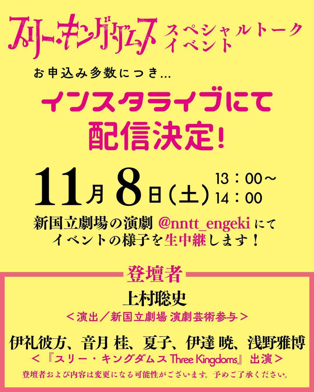 日本初演を12 月に控え、演出を担う上村聡史、そして出演者から伊礼彼方、音月   桂、夏子、伊達    暁、 浅野雅博の  5 名が登場し、『スリー・キングダムス    Three Kingdoms』の魅力や作品世界を語りつくすスペシャルトークイベントが開催決定。